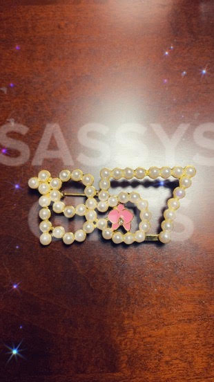 Beautiful Founding Year Pin in White Pearls with a pink orchid in the 5. Measures approx 2" x 1"