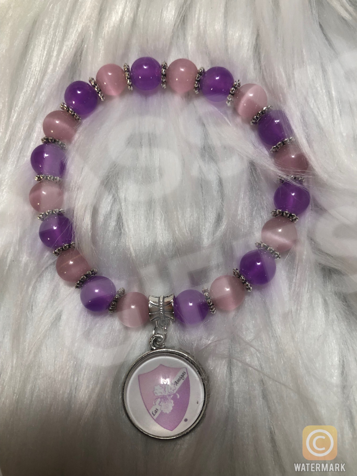 Light Pink and Lavender Cat Eye Pearl-Like Beads with Shield Charm. Stretch band. Fits most wrist sizes.