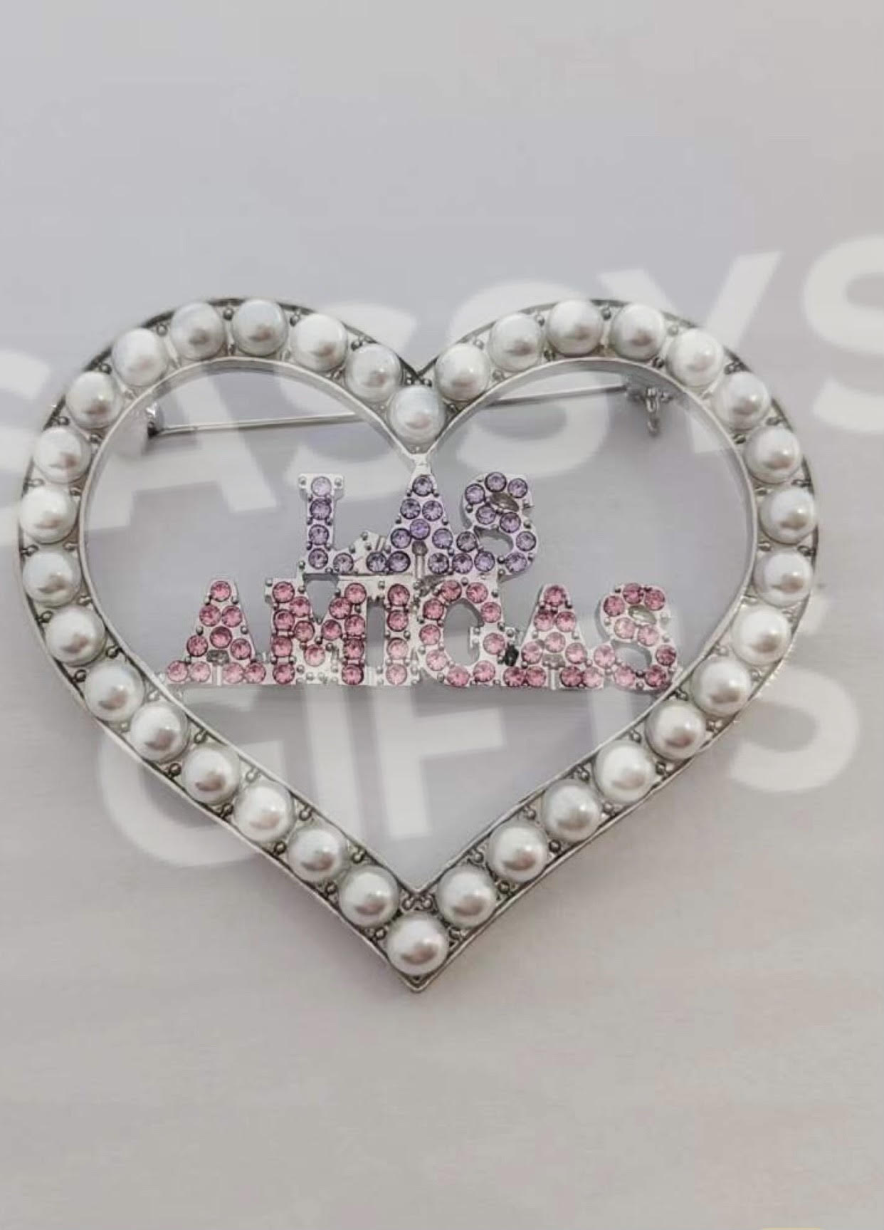 Approximately 2" and filled with white pearls and LAS AMIGAS in the middle in pink and lilac enamel.